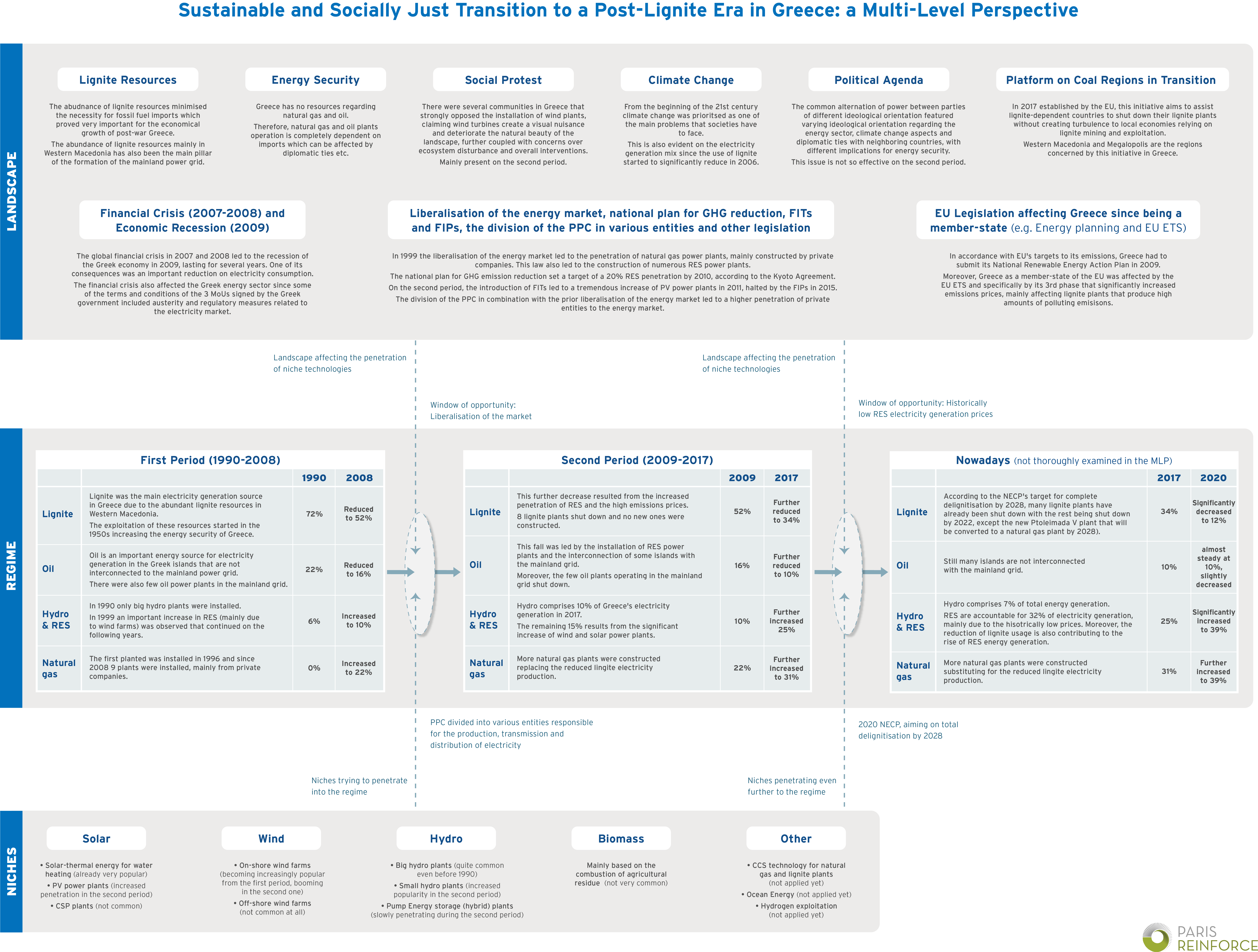 This infographic builds upon the Multi-Level Perspective framework and further focuses on the phase-out of the dominant fossil fuel in the Greek electricity mix, rather than solely exploring the phase-in of new technologies. By delving into the landscape that established lignite as the mainstream energy resource in Greece, as well as the factors sustaining its dominance despite niche technologies and innovations challenging the regime, it discusses how the envisaged decarbonisation can be socially just and effective across multiple sustainability dimensions.