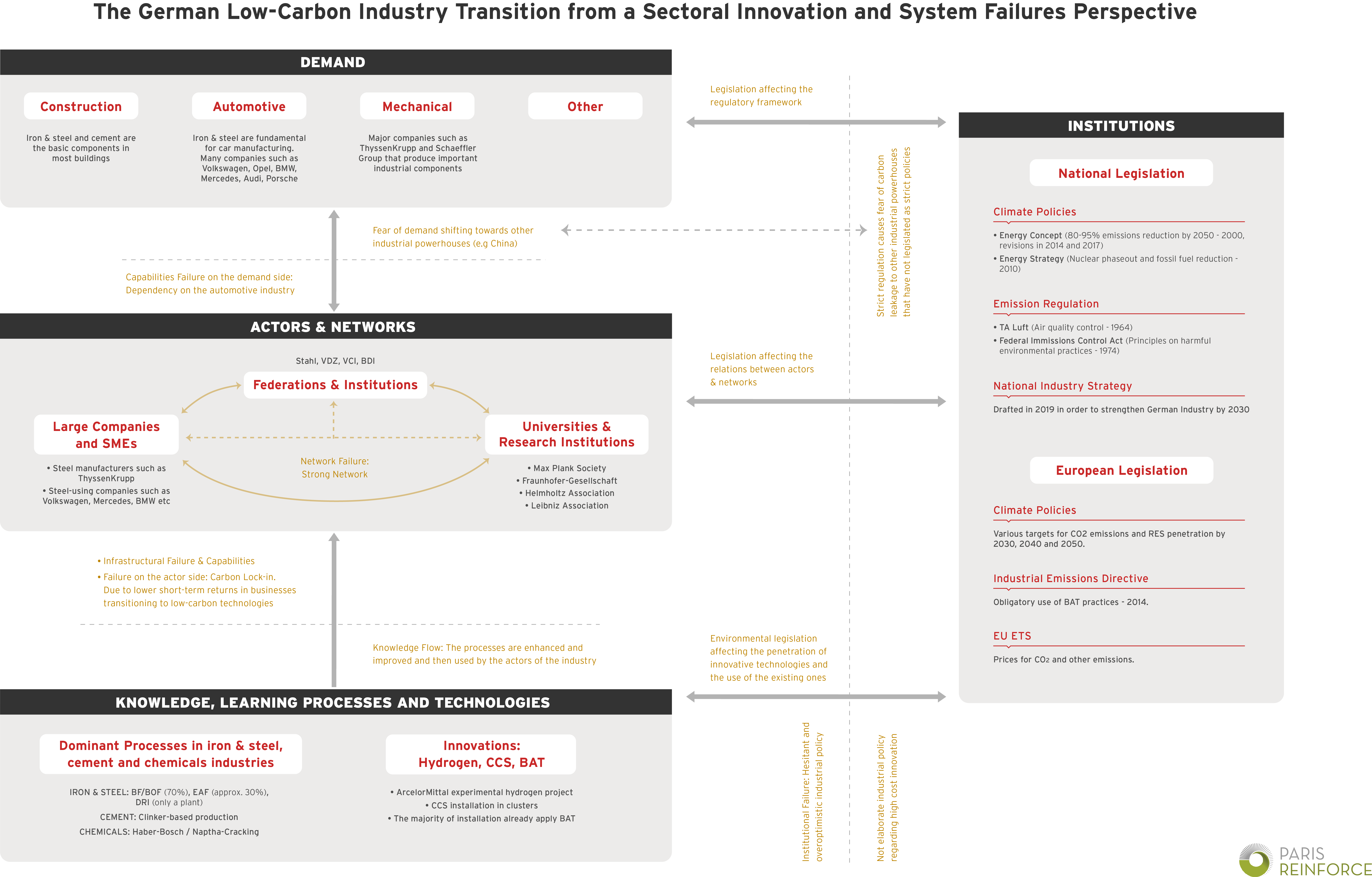 This infographic reviews the energy-intensive iron and steel, cement and chemicals industries of Germany, a major emitting country with significant activity. Based on the Sectoral Innovation Systems and the Systems Failure framework, it aims to capture existing and potential drivers of or barriers to diffusion of sustainable industrial technologies and extract implications for policy. Results indicate that actor structures and inconsistent policies have limited low-carbon innovation. A critical factor for the successful decarbonisation of German industry lies in overcoming lobbying and resistance to technological innovation caused by strong networks.