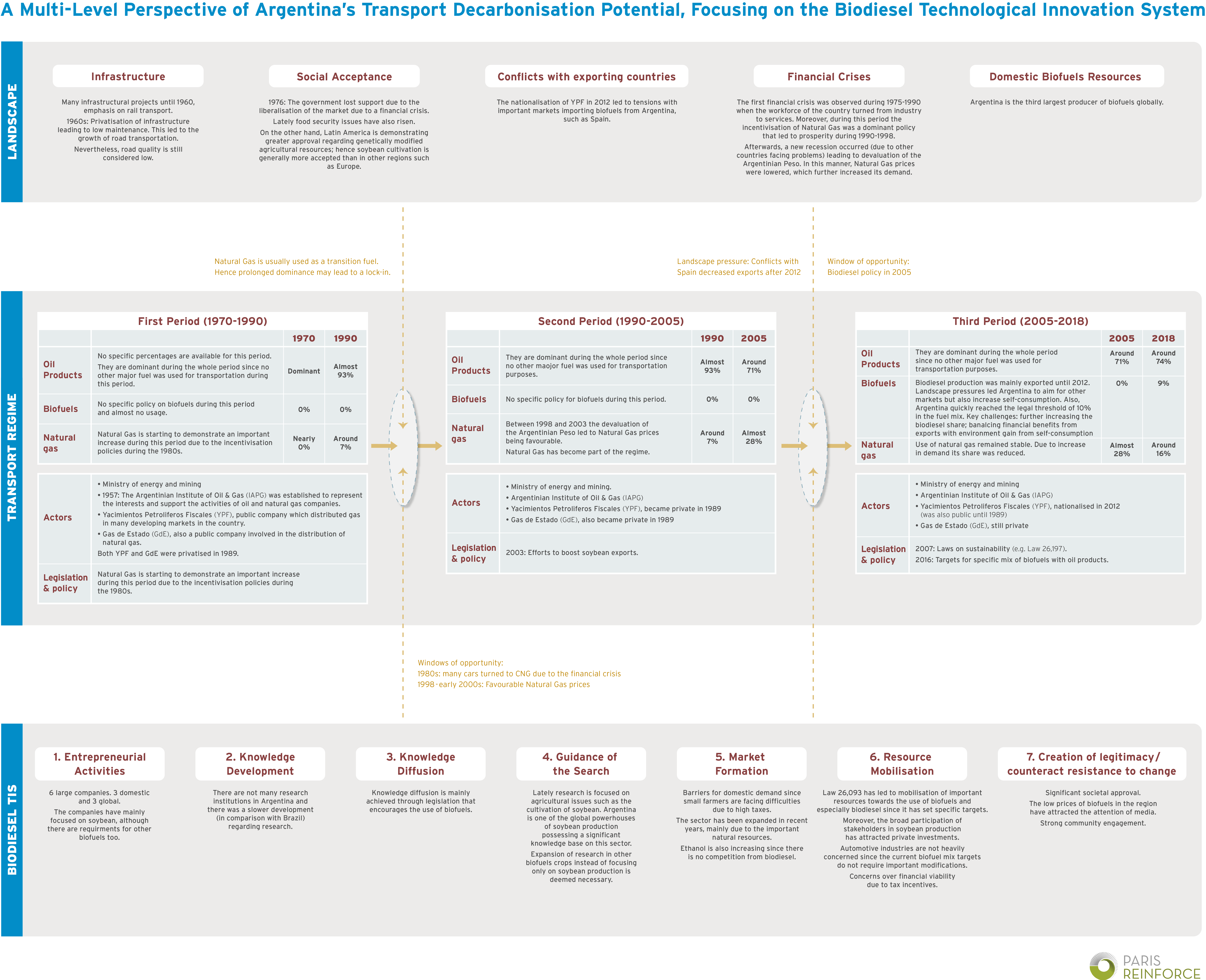 This infographic reviews the transport sector of Argentina and the emergence of biodiesel. Using the MLP and TIS frameworks, it sheds light on the historical evolution of the dominant regime of the Argentinian transport sector and helps understand how the dependency of fossil fuels was shaped in line with continuous pressures from oil, economic, and institutional crises from the landscape. It also highlights the emergence of the biodiesel technological system, its interactions with other technologies, and the progress that allowed it to break through from a niche and become part of the regime.