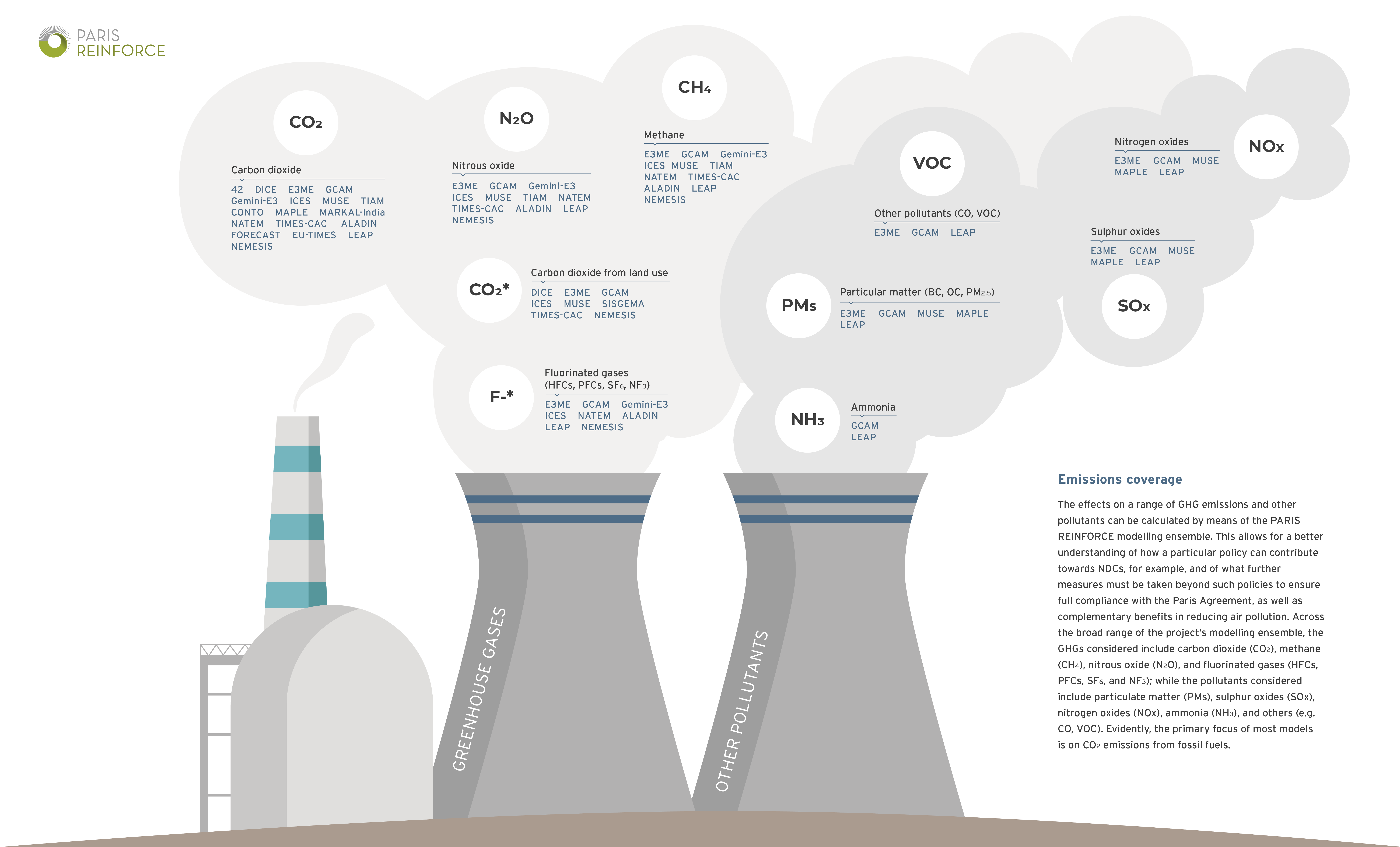 This infographic sets out to explain how different greenhouse gas (GHG) emissions and other pollutants are represented in climate-economy and energy quantitative system models. It also illustrates how each emission type is represented in the PARIS REINFORCE modelling suite.