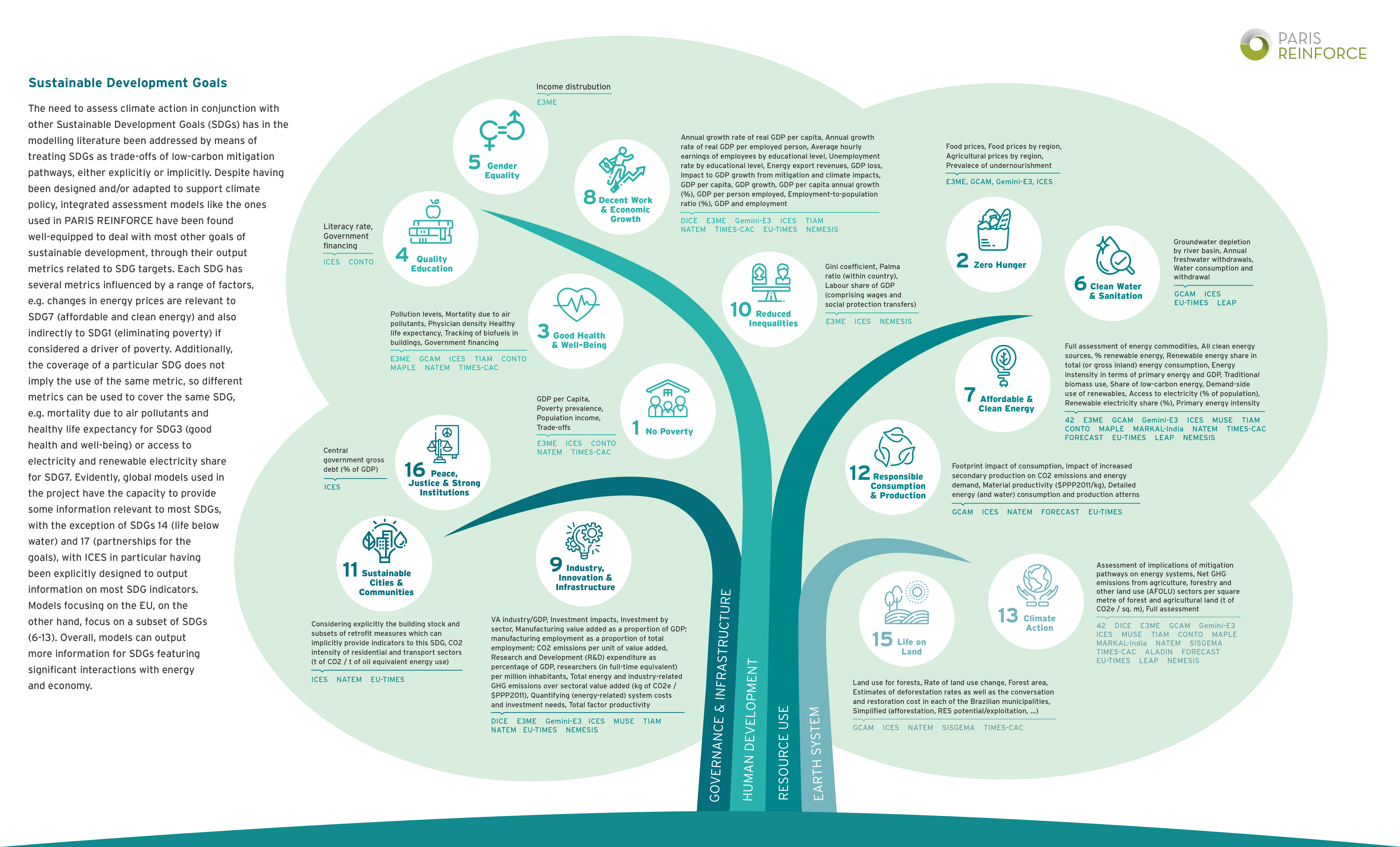 This infographic sets out to explain how Sustainable Development Goals (SDGs) are represented in climate-economy and energy quantitative system models. It also illustrates how each SDG indicator can be extracted by the PARIS REINFORCE modelling suite.