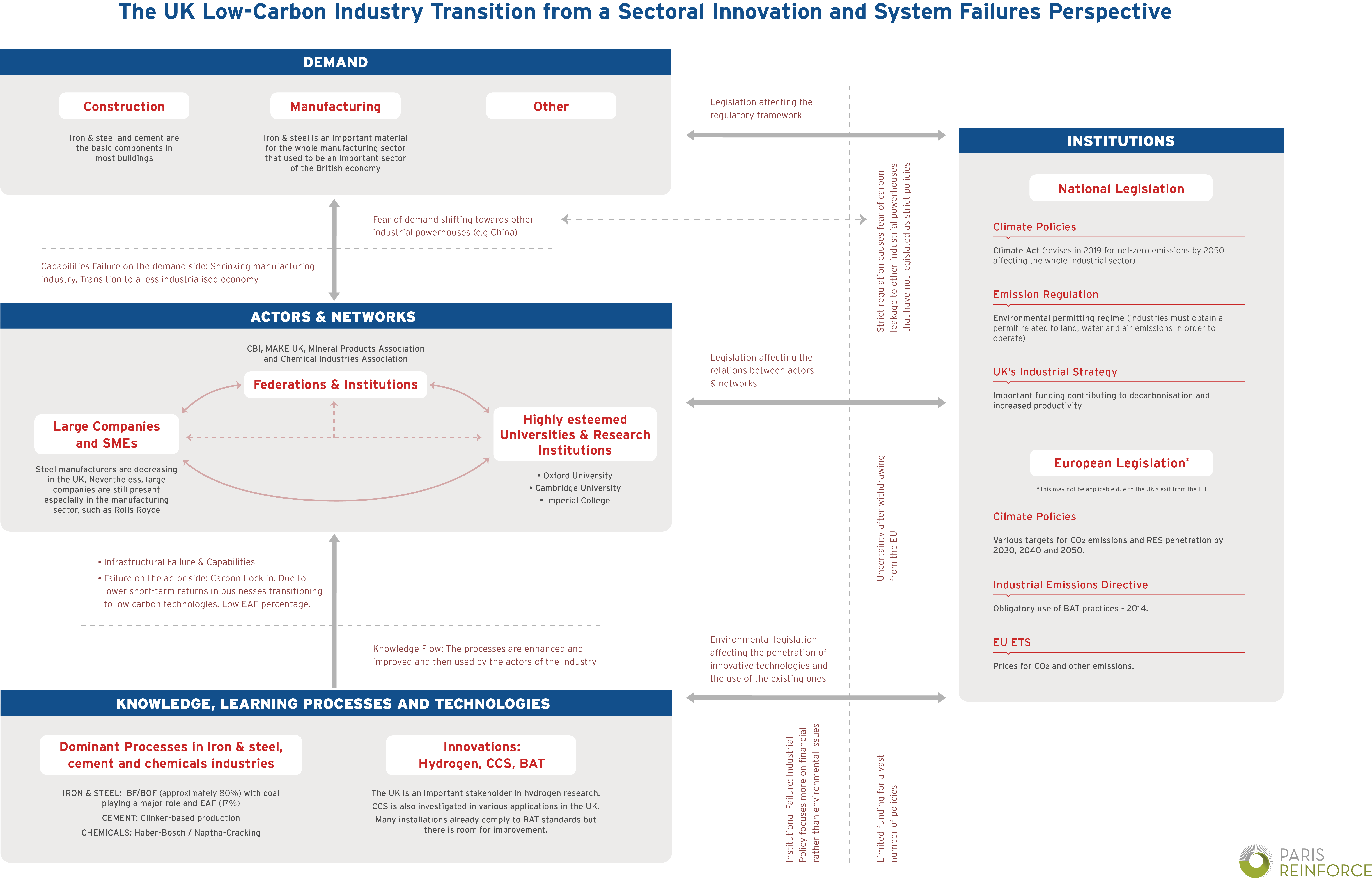 This infographic reviews the energy-intensive iron and steel, cement and chemicals industries of the United Kingdom, a major emitting country with significant activity. Based on the Sectoral Innovation Systems and the Systems Failure framework, it aims to capture existing and potential drivers of or barriers to diffusion of sustainable industrial technologies and extract implications for policy. Results indicate that actor structures and inconsistent policies have limited low-carbon innovation. A key to UK industrial decarbonisation is to drive innovation and investment in the context of an industry in decline and in light of Brexit-related uncertainty.