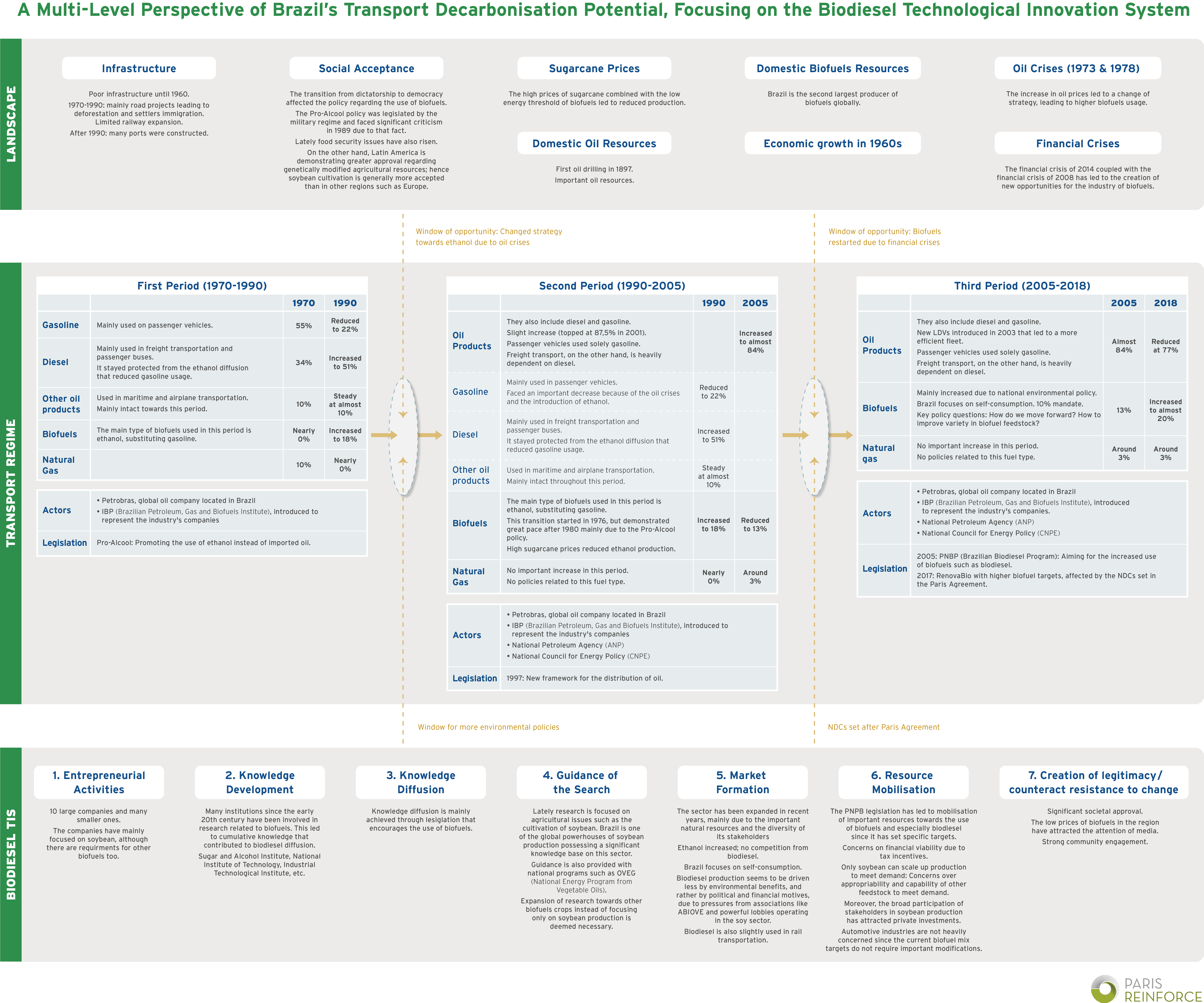 This infographic reviews the transport sector of Brazil and the emergence of biodiesel. Using the MLP and TIS frameworks, it sheds light on the historical evolution of the dominant regime of the Brazilian transport sector and helps understand how the dependency of fossil fuels was shaped in line with continuous pressures from oil, economic, and institutional crises from the landscape. It also highlights the emergence of the biodiesel technological system, its interactions with other technologies, and the progress that allowed it to break through from a niche and become part of the regime.