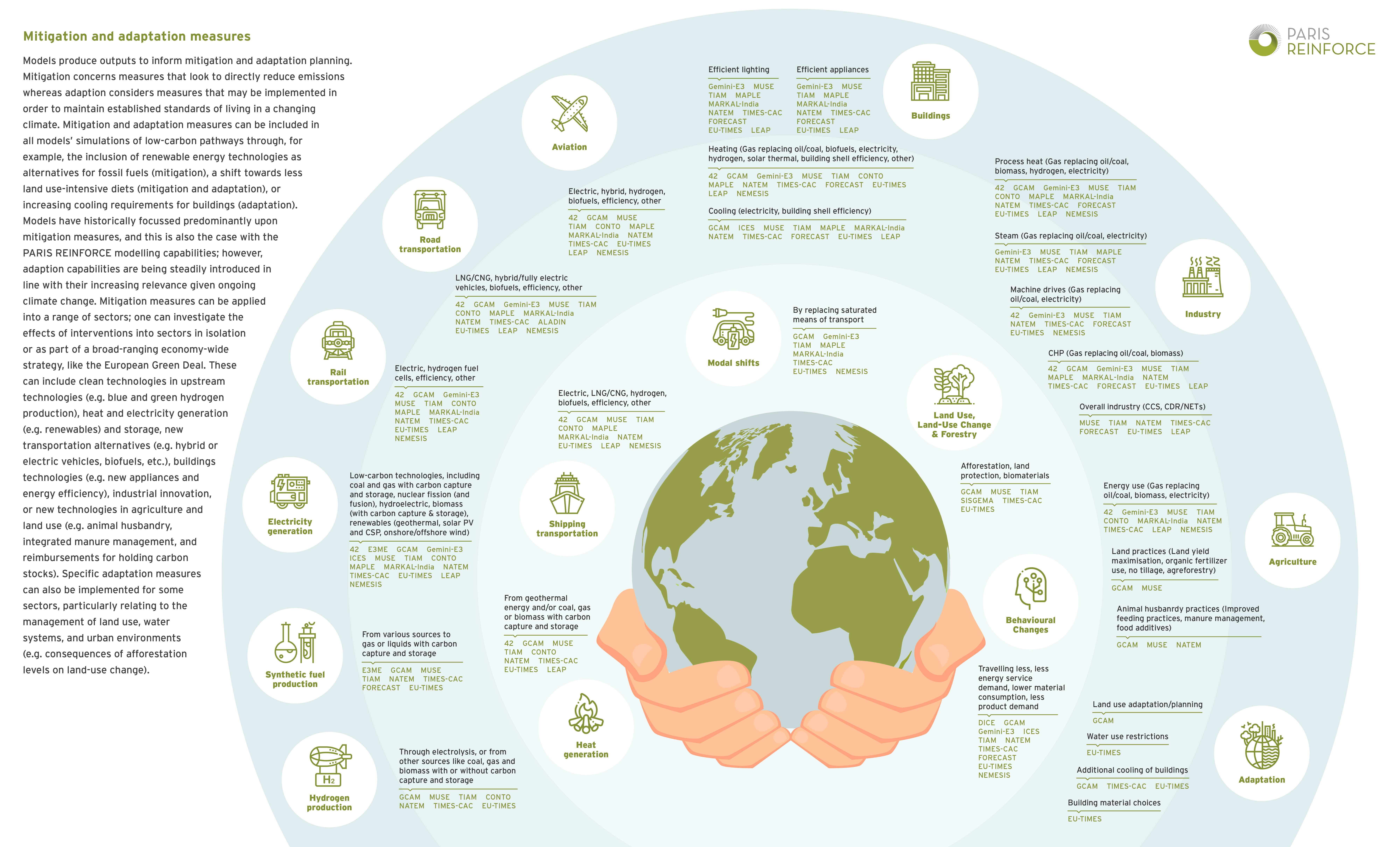 This infographic sets out to explain how different mitigation and adaptation technologies are represented in climate-economy and energy quantitative system models. It also illustrates how each mitigation and adaptation measure is represented in the PARIS REINFORCE modelling suite.