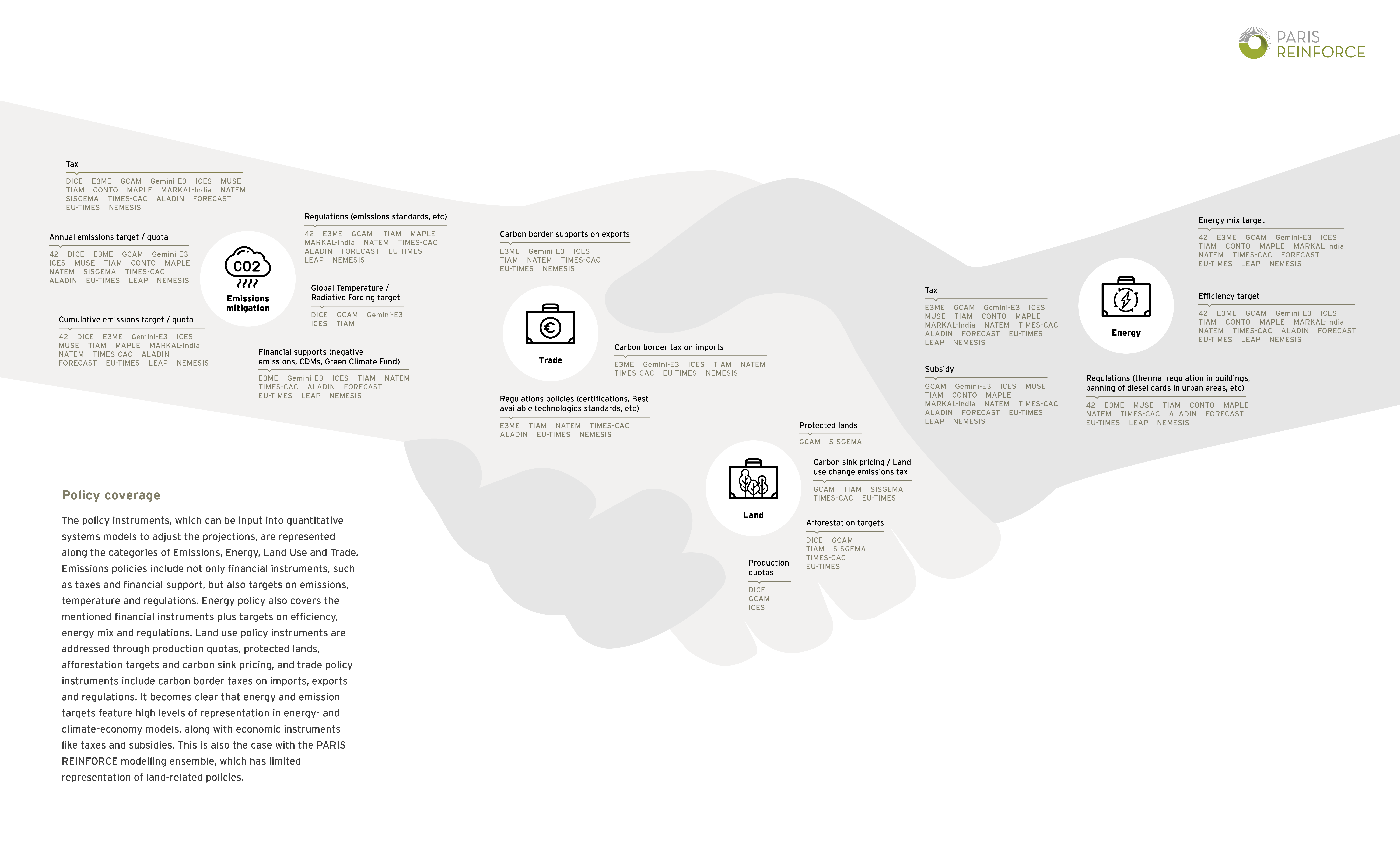 This infographic sets out to explain how different types of policy instruments and strategies are represented in climate-economy and energy quantitative system models. It also illustrates how each policy is represented in the PARIS REINFORCE modelling suite.