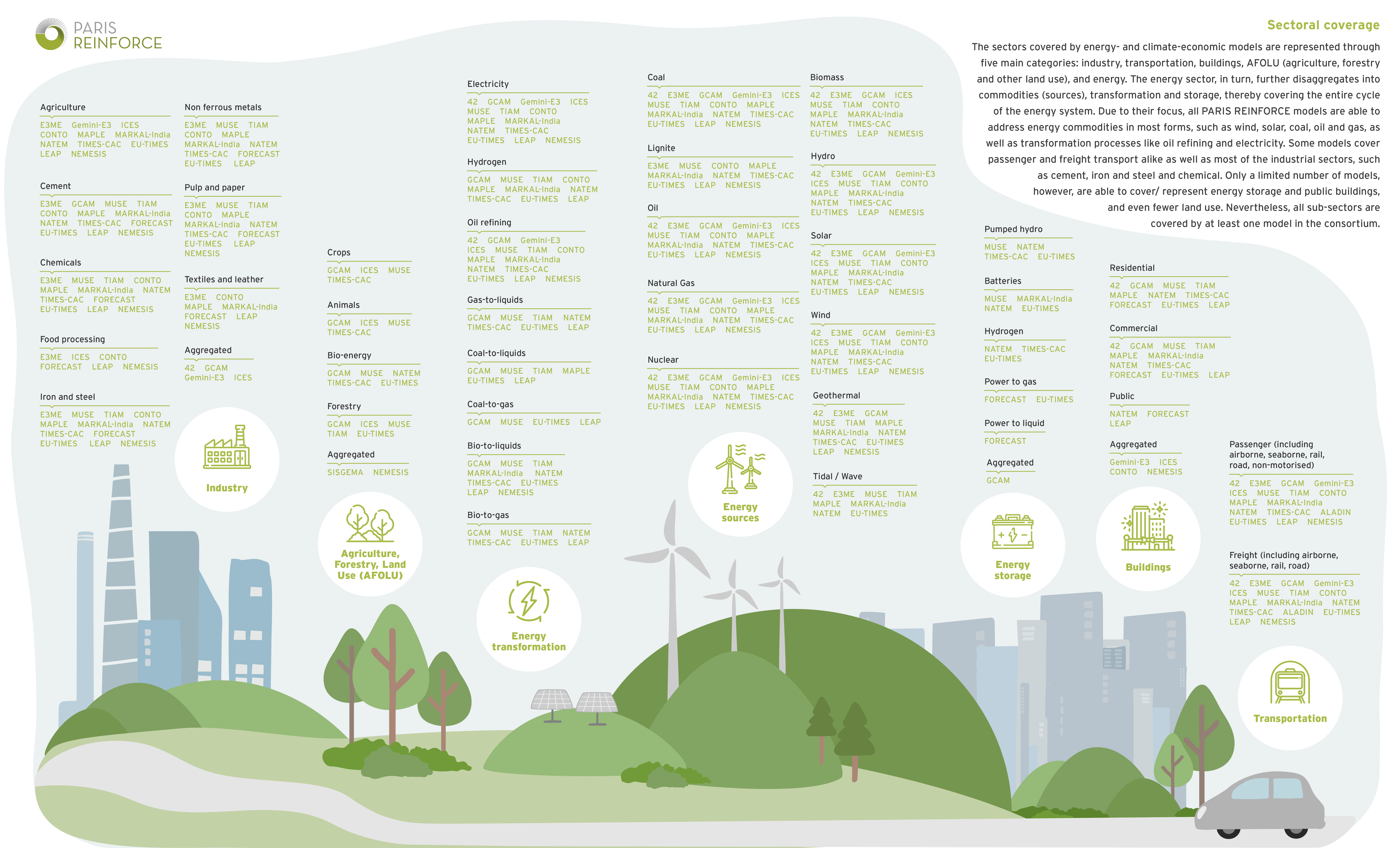 This infographic sets out to explain how different economic sectors are represented in climate-economy and energy quantitative system models. It also illustrates how each sector of the economy is represented in the PARIS REINFORCE modelling suite.