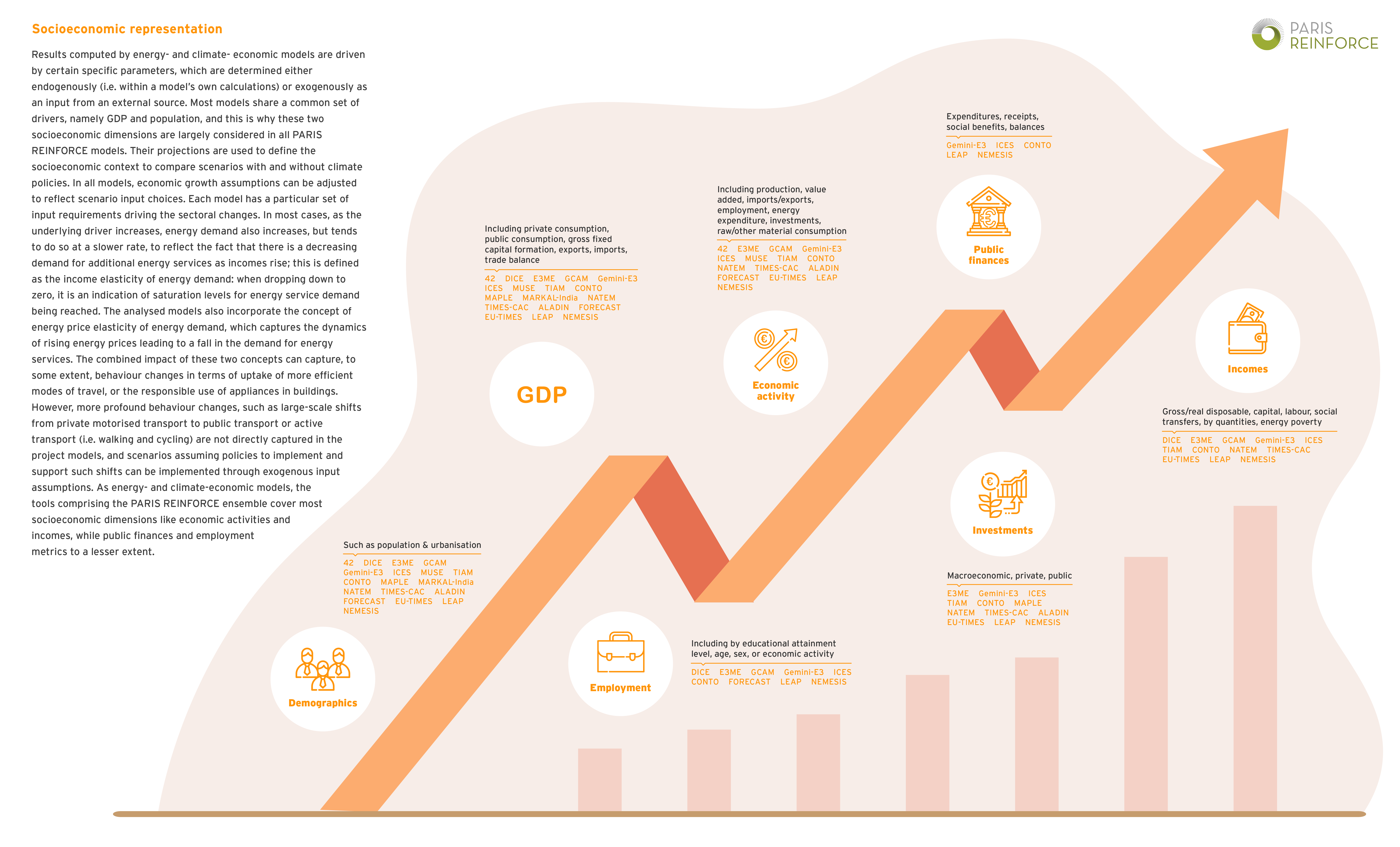 This infographic sets out to explain how socioeconomic variables are represented in climate-economy and energy quantitative system models. It also illustrates how each socioeconomic variable is represented in the PARIS REINFORCE modelling suite.